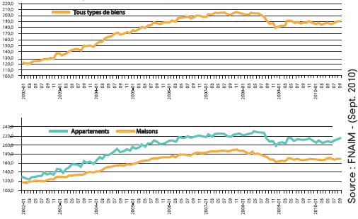 Selon la FNAIM, les prix des appartements anciens ont progressé de +2,5% au cours du troisième trimestre 2010. Les prix des maisons, eux, sont restés stables. En moyenne et dans l'ensemble, les prix n'enregistrent plus aucun signe de baisse : ils progressent même de +0,8% sur un an (12 derniers mois/12 mois précédents). Avec une hausse annuelle moyenne de +0,4% sur un an, les prix des appartements sont comparables à ceux observés mi-2009. Sur le marché des maisons, la variation annuelle moyenne des prix, négative depuis huit trimestres consécutifs, est à nouveau positive : +1,2% sur un an.
