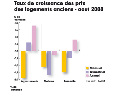 Selon la Fnaim, nouveau recul de -1.5%. du prix des logements au mois d'août, avec -1,9% pour les appartements et -1,1% pour les maisons. Cette baisse est confirmée au cours des trois derniers mois sur la France entière (-0,5%). La tendance annuelle ne montre plus qu'une faible croissance (+0,8%) et apparaît en recul par rapport au mois précédent (évolution annuelle de +1,2% en juillet).