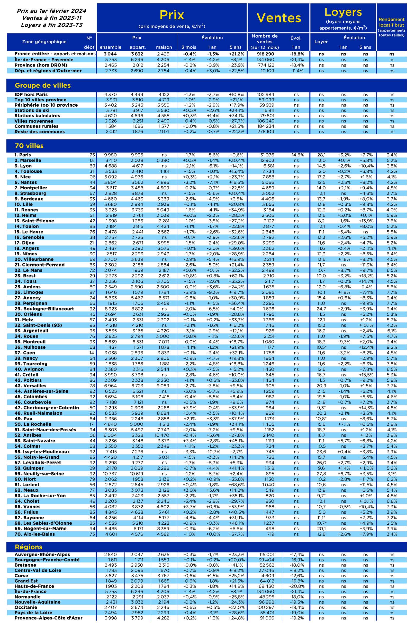 D'autres grandes villes connaissent d'importantes baisses de prix : Lyon (-6,1%), Nantes (-7,1%), Bordeaux (-4,9%), à l'exception de Nice qui résiste encore (+2,1%). D'une manière générale, le marché baisse le plus là où les prix sont les plus élevés, car la sensibilité des acquéreurs aux taux des crédits y est plus forte. Les grandes métropoles, où les prix et le recours au crédit sont élevés, subissent plus durement qu'ailleurs en France la perte de capacité d'achat immobilier des ménages.