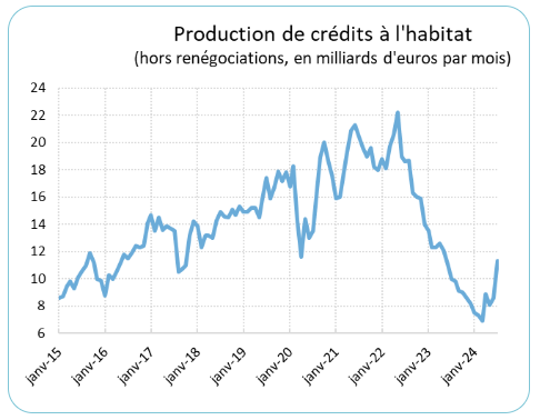 La production de crédits a été divisée par trois en deux ans, pâtissant de la baisse des ventes dans l'ancien et de la chute dans le neuf. Elle se redresse depuis quelques mois, mais demeure moitié moins élevée que ses plus hauts niveaux. Cette évolution récente pourrait être le signe d'une stabilisation à venir des ventes. Le niveau encore relativement bas de la nouvelle production se traduit par une poursuite de la baisse des encours de crédit : les remboursements de crédits restent supérieurs aux mensualités des nouveaux crédits.
