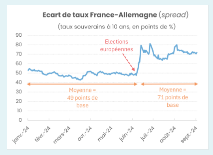 Les taux de crédits dépendent du refinancement des banques françaises, qui est lui-même très corrélé à celui de l'Etat (taux souverain à 10 ans). La hausse récente du spread franco-allemand, c'est-à-dire de l'écart entre les taux longs français et allemand, qui est au plus haut depuis plus de 11 ans, est symptomatique de la plus grande frilosité des investisseurs à prêter à la France, à cause de l'incertitude politique. Elle se répercute sur les taux de crédits immobiliers, dont on peut penser qu'ils seraient environ 22 points de pourcentage plus bas sans l'incertitude politique actuelle. Concrètement, cela veut dire que les taux de crédits immobiliers pourraient être de 3,40% contre 3,62% actuellement. Et que, pour un acquéreur ayant une mensualité de 1000 euros sur 20 ans, l'instabilité politique entraîne une hausse de la mensualité de 20 euros (à 1020 euros). Soit un coût total du crédit majoré de 4720€ sur l'ensemble de la durée du crédit !