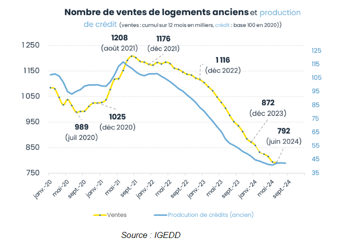 A fin juin 2024, 792 000 ventes avaient été réalisées sur 12 mois, un chiffre en baisse de -21% sur un an et de -31% sur trois ans ! Le nombre de transactions est redescendu nettement en-dessous des niveaux « pré-covid ». La baisse pour l'année 2024 devrait être d'environ 8 à 10%, assez conforme à nos prévisions initiales (800 000 ventes, -8%), qui étaient déjà parmi les plus pessimistes du marché. Cette baisse des ventes concerne par ailleurs tous les territoires. La baisse de l'activité se prolonge donc, mais son rythme ralentit, avec une baisse très légère sur le dernier mois. Cette tendance vers une stagnation à un niveau bas devrait se poursuivre dans les prochains mois, en lien avec la stabilisation de la production de crédit.
