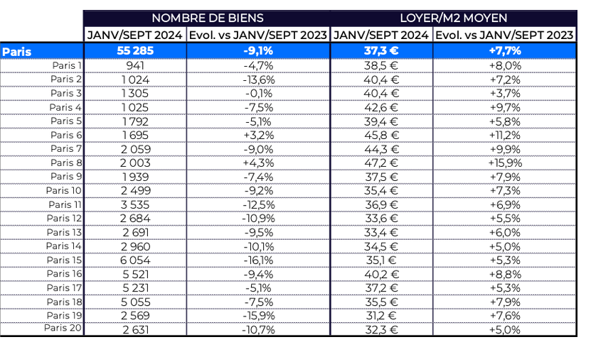 Enfin, les loyers/m² moyens augmentent fortement dans le centre de la capitale avec notamment +15,9% en 1 an dans le 8ème, +11,2% dans le 6ème ou +9,9% dans le 7ème, malgré le dispositif d'encadrement des loyers en vigueur.