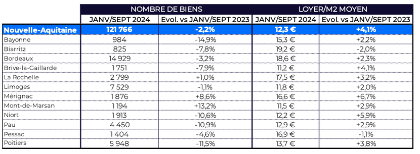 La Nouvelle-Aquitaine, appréciée pour sa qualité de vie et ses prix immobiliers attractifs, voit cependant le marché de la transaction ralentir ces derniers mois, entrainant une hausse sensible de l'offre, alors que la demande est en recul. Conséquence immédiate : le marché de la location se tend entre contraction du nombre de biens disponibles et augmentation des loyers/m². Pour autant, ces constats sont variables selon les villes étudiées. Décryptage avec l'Observatoire GH Transaction et Location pour la période janvier-septembre 2024.