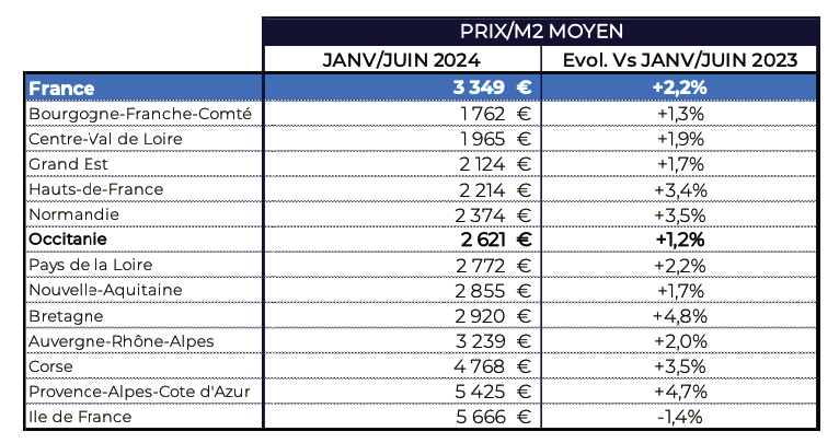 Au cours des 6 premiers mois de l'année, le marché de la transaction immobilière a ralenti en Occitanie. Si le nombre de biens mis sur le marché a sensiblement augmenté (+9,2% en 1 an), la demande est devenue inférieure à l'offre faute d'accès au financement pour les porteurs de projets immobiliers. Par conséquent, les prix/m2 ont eu tendance à se stabiliser (+1,2% en 1 an) aux environs de 2 600 €. Une région qui demeure donc attractive grâce une valeur inférieure à la moyenne nationale (3 349 €).