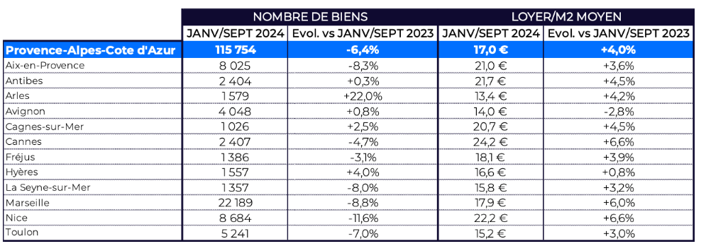 Si les loyers augmentent dans la quasi-totalité des villes étudiées, l'offre connait pour autant des évolutions contrastées. Généralement, les villes phares de la région subissent une contraction de l'offre locative, alors que le nombre de biens à louer progresse par exemple à Arles, Cagnes-sur-Mer et Hyères. Possible retour de certaines locations saisonnières sur le marché de la location longue durée.