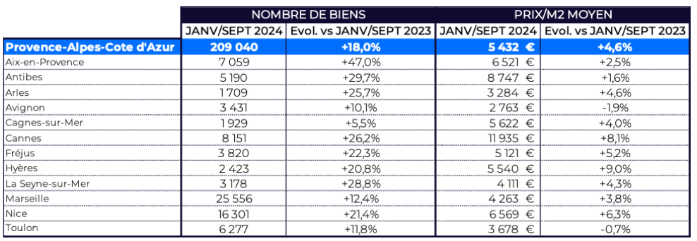 Ces tendances se vérifient sur la majorité des villes étudiées, avec une dynamique de l'offre soutenue et une valeur en hausse. Deux exceptions sont à noter : Avignon qui voit ses prix/m² afficher un recul de -1,9% par rapport à janvier-septembre 2023 et Toulon, à -0,7%, sur la même période. Une des pistes d'explications résident dans la part des passoires énergétiques sur ces 2 villes (biens avec un DPE de classe F ou G) plus importante qu'ailleurs.