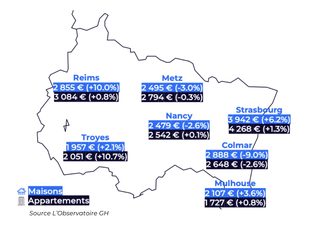 Et là encore, derrière la tendance globale s'affichent des situations très diverses selon les villes étudiées dans l'Observatoire GH. Ainsi, en janvier-février 2024 par rapport à janvier-février 2023, les prix/m² moyens progressent à Troyes (+7.7%), à Reims (+4.2%) ou encore à Strasbourg (+1.7%), quand ils sont stables à Nancy (-0.5%) et à Mulhouse (-0.8%) et qu'ils affichent une baisse plus ou moins marquée à Metz (-1.4%) et Colmar (-5.3%).