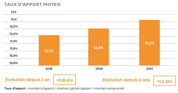 Autre conséquence des prix de l'immobilier : l'augmentation du revenu annuel nécessaire pour l'achat d'un bien quand on est primo-accédant. En 2021, un emprunteur seul gagne en moyenne 32 096 € en 2021 (+2,9 % par rapport à 2019) et un couple 55 489 € (+3,6 % par rapport à 2019). Le taux d'apport connaît lui aussi une hausse, passant de 16,5 % en 2021 contre 15 % en 2019. « Ces augmentations traduisent la tension sur les prix des biens ainsi qu'un resserrement des critères d'octroi des banques », explique Olivier Lendrevie.