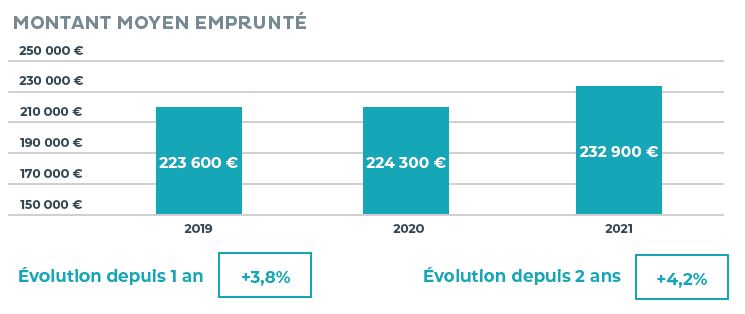 On observe que depuis 2019, le montant moyen emprunté par les primo-accédants a augmenté de 4,2% pour atteindre en moyenne 232 900 € en 2021. Cette augmentation de l'enveloppe allouée au projet immobilier s'aligne sur la hausse des prix, causée par une offre limitée, une demande forte et des taux bas.