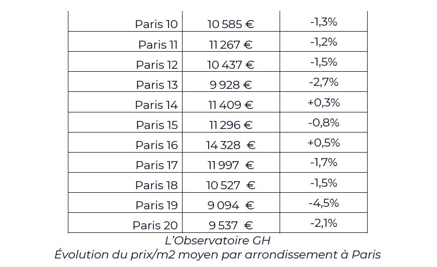 À contre-courant des informations diffusées par certains acteurs, l’analyse complète du marché immobilier de l’Observatoire GH montre que Paris plie mais ne rompt pas. Les prix au m² constatés dans la capitale ne reculent pas (encore) sur le 1er semestre 2023 : +1.4%, c’est tout au plus « net un ralentissement de la hausse ». La capitale affiche toujours une valeur élevée, avec une moyenne de 12 593€/m².