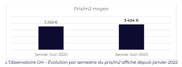 Contrairement aux annonces alarmantes de plusieurs acteurs du marché, la réalité des prix au m² montre une hausse de +4.8% sur le 1er semestre 2023 versus le 1er semestre 2022, pour s’élever désormais à 3 424€/m² en moyenne.