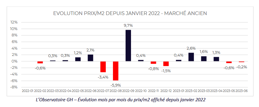 Comment expliquer cette tendance ? En l’observant mois après mois : sur les 4 premiers mois de l’année, les prix sont restés à la hausse (entre +0.4% et +2.6% selon le mois) : le ralentissement du marché a réellement démarré en mai. Mais la baisse reste timide pour le moment : -0.6% au mois de mai puis -0.2% au mois de juin.