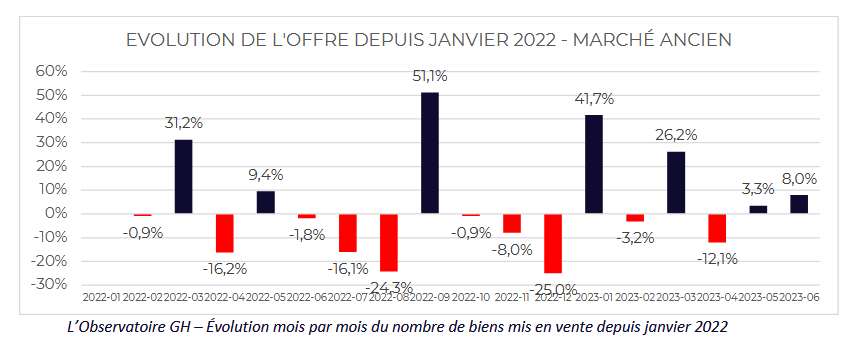 Si le marché semble poursuivre sa dynamique de mises en vente avec une offre de biens commercialisés à +6.1% en 1 an, c’est plutôt lorsqu’on compare le 1er semestre 2023 à la fin de l’année 2022 que l’on constate la reconstitution rapide des stocks de biens à vendre : +24.3% versus juillet-décembre 2022. Effet de saisonnalité en partie, mais pas uniquement si l’on en croit l’évolution mois par mois de l’offre mise en vente.