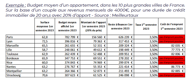 Dans 5 des 10 grandes villes étudiées, un couple avec des revenus de 4 000€ par mois et avec 20% d’apport ne peut plus emprunter pour acheter un appartement !