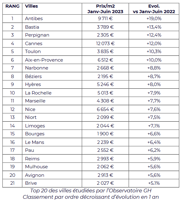 Elles entrainent avec elles la métropole phocéenne : Marseille se classe 11ème de ce classement, avec un prix au m² en hausse de +7,7%, affiché désormais à 4 308€ en moyenne.