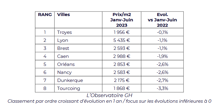 Parmi les 57 villes analysées dans l’Observatoire GH, 8 affichent des prix au m² en retrait par rapport au 1er semestre 2022. Pour autant, les baisses restent limitées car comprises entre -0.1% et -3.3% sur 1 an.