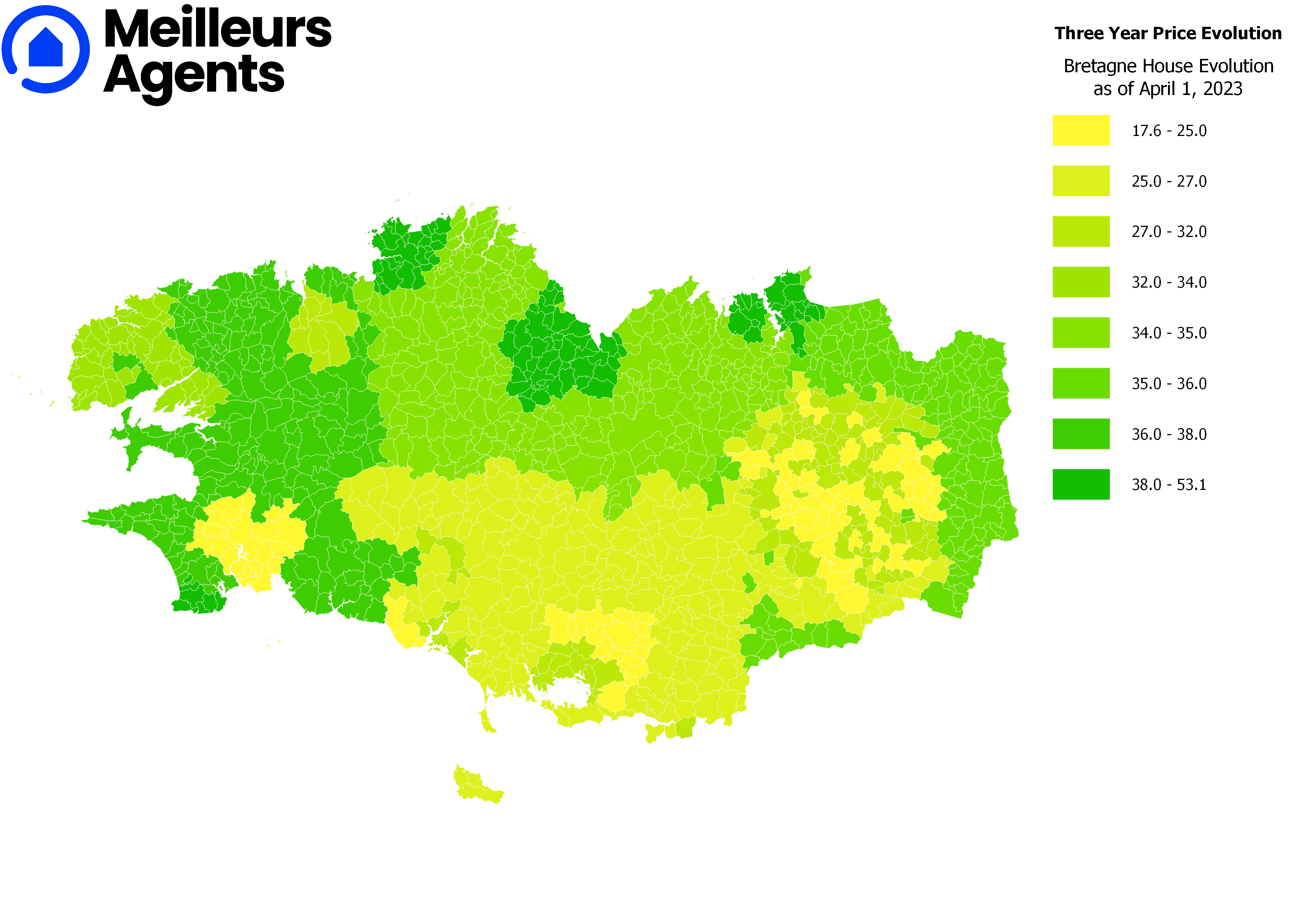 Animé par son ambition d’innovation continue, Meilleurs Agents affine la granularité de son analyse afin d’offrir l’estimation immobilière la plus fiable et, désormais, la plus étendue du marché. Grâce à la construction de nouveaux indices, Meilleurs Agents révèle le prix des logements (appartement et maison) et leur évolution dans l’ensemble du territoire, notamment dans les 36 000 communes de France métropolitaine. Cette avancée scientifique permet, entre autres, d’éclairer aujourd’hui spécifiquement la dynamique particulière qu’a connu le marché des maisons ces 3 dernières années en Bretagne.