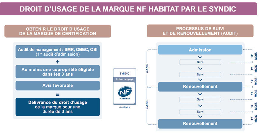 Avec la certification NF Habitat adaptée aux copropriétés en exploitation, les syndics bénéficient à leur tour d'un repère de qualité et de savoir-faire. Avec NF Habitat, le syndic est au coeur du processus de certification : c'est sur lui que le syndicat de copropriétaires doit s'appuyer pour que la copropriété obtienne la certification NF Habitat. Le syndic doit au préalable obtenir auprès de CERQUAL Qualitel Certification, filiale de l'Association QUALITEL, le droit d'usage de la marque NF Habitat. Deux conditions sont à remplir pour obtenir ce droit d'usage :