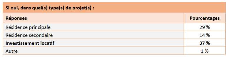 Pour les personnes qui souhaitent se lancer dans l'immobilier, plus de 37 % déclarent choisir d'abord l'investissement locatif. Pour 29 %, ce sera dans le cadre d'une résidence principale et pour 14 % une résidence secondaire.