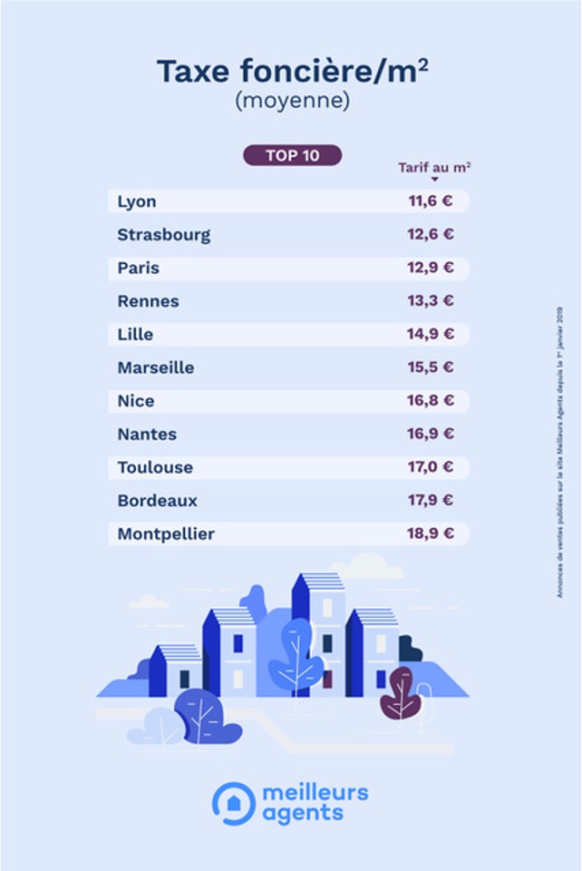 - Il y a une grande disparité selon les villes, le montant de la taxe foncière fluctue entre 508€ (Paris) et 864€ (Bordeaux) par an pour un T2 de 40 m2 et entre 735€ (Lyon) et 1 177€ (Montpellier) pour un T3 de 65m2;
