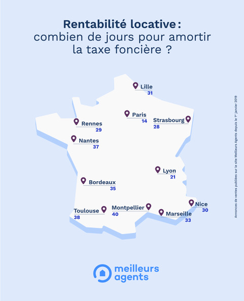 Pour les Français qui réalisent des investissements locatifs, il y a une assez forte inégalité au niveau des villes. Ainsi à Paris, le montant de la taxe foncière équivaut à 14 jours de location d'un logement, à Lyon le rapport est de 21 jours, et jusqu'à 30 et 31 jours pour Nice et Lille, soit un mois complet. Comparativement, Montpellier, et Toulouse entre-autres, s'en sortent moins bien puisque dans ces 2 villes il faut presque 1 mois et demi pour couvrir la taxe foncière (respectivement 40 et 38 jours de location). Pour Barbara Castillo Rico : « Au moment de réaliser un investissement locatif, les Français s'appuient en général sur des indicateurs comme le taux et le nombre d'années de crédit ou encore le montant du loyer moyen à venir. Ils oublient souvent la part de la taxe foncière dans leur calcul, il sera pourtant important à mesurer au regard de ses répercussions sur la rentabilité locative ! ».