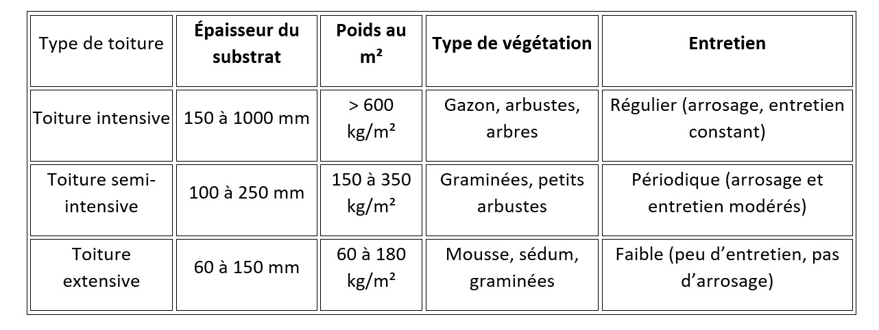 On distingue principalement trois types de toitures végétalisées selon leur complexité, épaisseur et entretien :