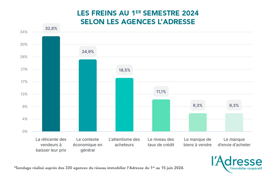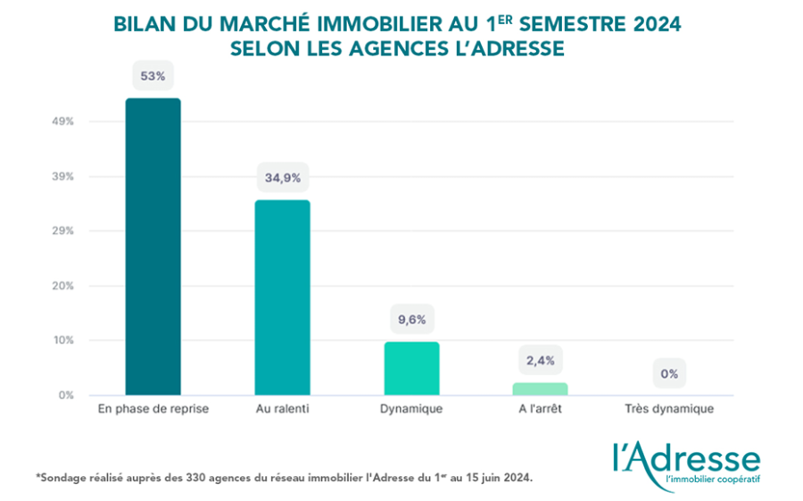Le réseau coopératif l'Adresse a réalisé comme tous les 6 mois un sondage interne auprès de ses 330 agences entre le 1er et le 15 juin 2024 pour dresser un bilan du marché immobilier sur le premier semestre et donner les perspectives pour 2024.