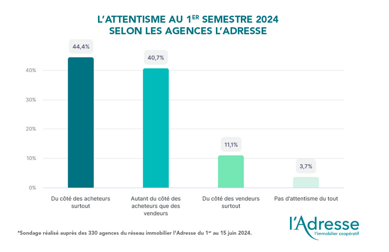 Selon 44 % des agences, au premier semestre, l'attentisme a été surtout marqué chez les acheteurs, quand 40 % considèrent qu'il a été aussi fort côté vendeurs que coté acheteurs. Seuls 11 % pensent que les vendeurs sont les plus attentistes.