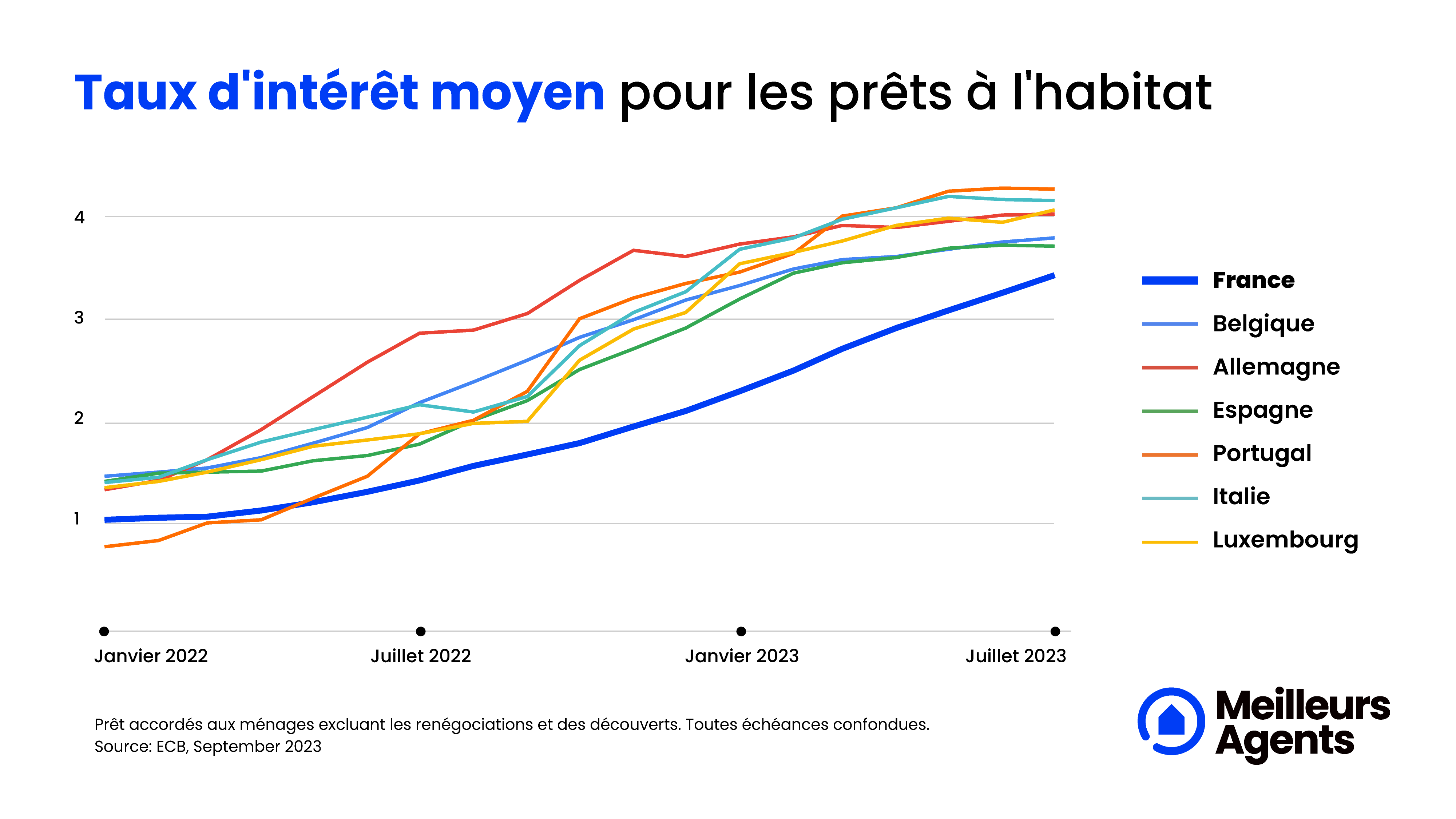 Sauf pour la France, qui fait figure d'exception dans le paysage européen et se distingue en enregistrant la plus forte augmentation des taux, avec une hausse de 1,3 points sur un an, dont 0,5 point pour les seuls trois derniers mois**. Les taux devraient maintenir leur trajectoire haussière en France dans les prochains mois, afin de converger vers les niveaux observés chez ses voisins européens. La France demeure cependant le pays avec les taux les plus bas par rapport aux autres pays étudiés.