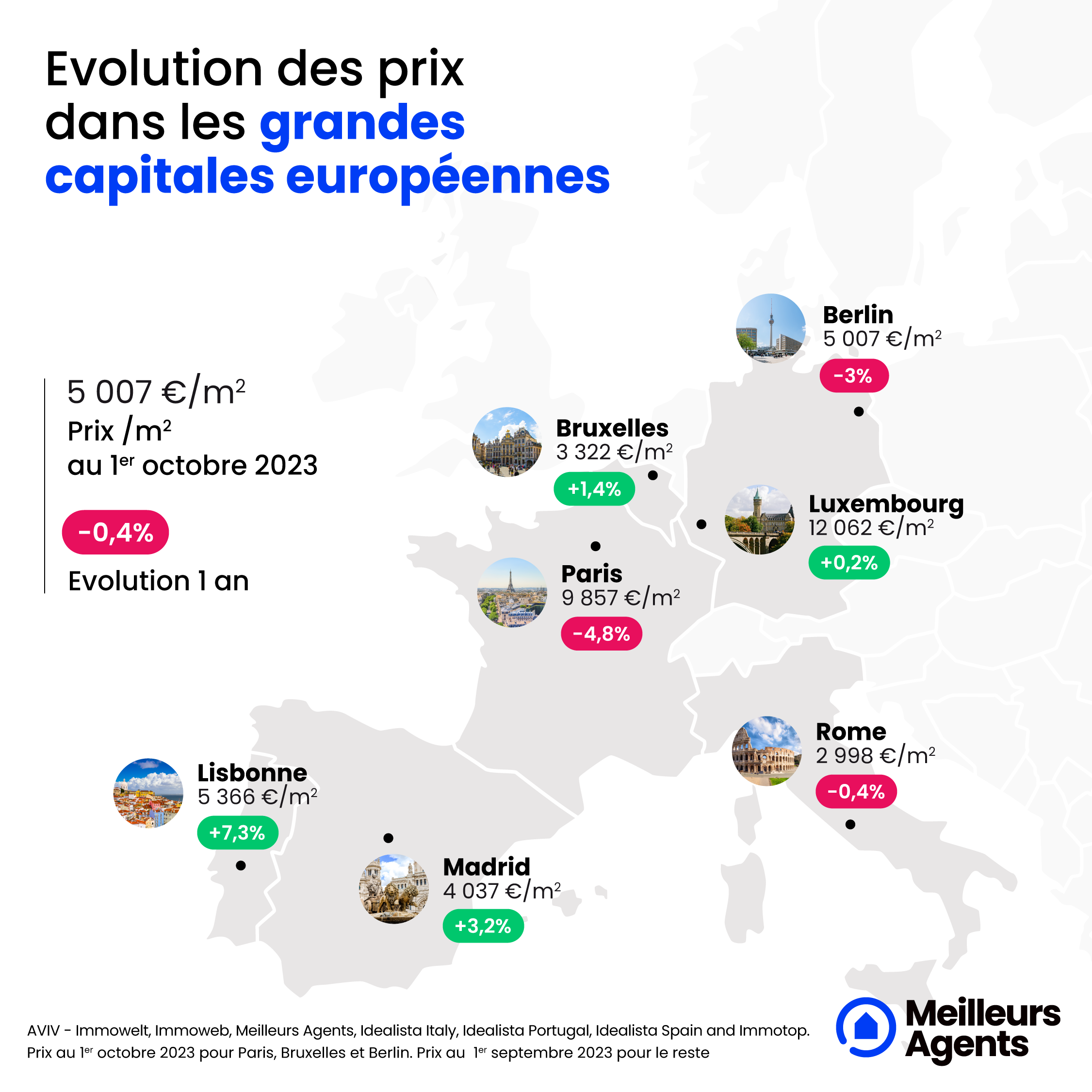 Alors que le marché immobilier parisien est entré dans un cycle baissier depuis la crise du Covid et qui s'est accéléré depuis plus d'un an, les autres capitales européennes connaissent-elles également un même désamour ? Leur marché est-il aussi fortement impacté par la nouvelle politique monétaire de la BCE ? Quelles sont celles qui affichent les plus fortes baisses de prix ? Qu'en est-il du pouvoir d'achat immobilier ? Meilleurs Agents, leader de l'estimation immobilière en ligne, dresse le panorama des marchés immobiliers dans les grandes capitales européennes* !