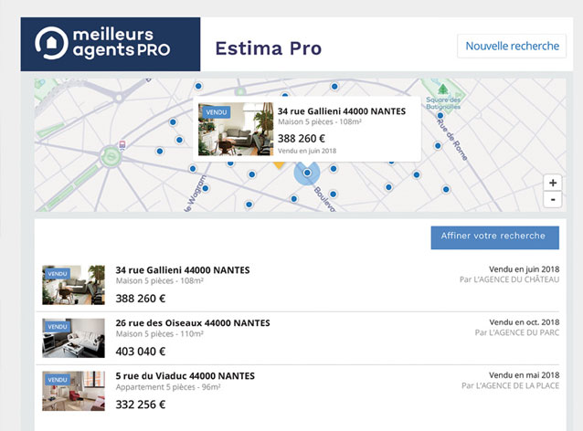 Ce service dédié aux professionnels répond à leurs attentes. 86%2 des agences partenaires ayant utilisé Estima Pro en sont satisfaites et plus de 7 agences utilisatrices sur 10 le recommandent. Elles y voient de réels bénéfices d'utilisation. En effet, simple et intuitif, cet outil est unique sur le marché. Il est le seul à concentrer les photos des biens, l'actualisation du prix de vente, et les biens vendus les plus récents du marché. Ces fonctionnalités apportent un vrai plus pour les particuliers, capables de mieux se projeter.